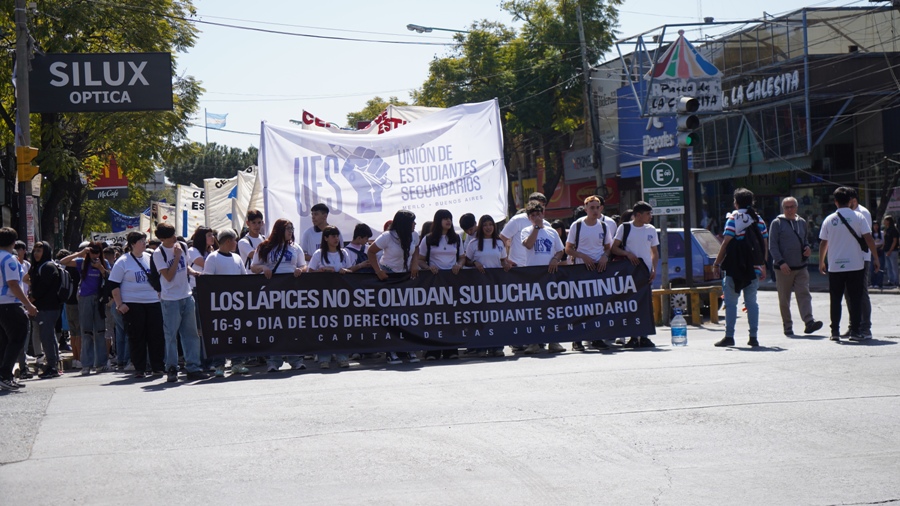 De esta forma, estudiantes caminaron desde la Estación de Merlo hasta la Casa de la Cultura de Merlo, bajo el lema de “Los lápices no se olvidan, su lucha continúa”. También estuvieron presentes familiares de alumnos detenidos y desaparecidos en Merlo, durante la última dictadura cívico-militar.