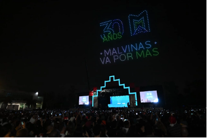 El espectáculo de primera calidad reunió música, danza y un despliegue de color con más de cien artistas en escena. La magia se hizo presente con Papá Noel volando entre la multitud y un cierre musical de gran nivel a cargo de la joven artista Ángela Torres, que conmovió a todos con su voz. La gran sorpresa de la noche fue el show de drones que iluminó el cielo con figuras icónicas de la Navidad y de la identidad e historia malvinense, sorprendiendo y emocionando a grandes y chicos. La Sagrada Familia, el tren Belgrano Norte, Papá Noél, un enorme “Malvinas 30 Años”, son algunas de las figuras que se pudieron ver desde cada rincón del distrito.